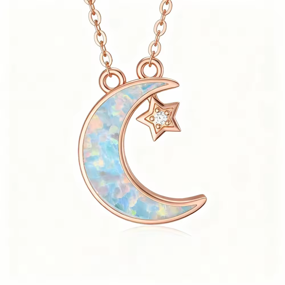 Descubre la cautivadora belleza de nuestro collar colgante de Oro Rosa de 10K con un impresionante diseño de estrella y luna de ópalo, perfecto para mujeres que aman la joyería inspirada en lo celestial.