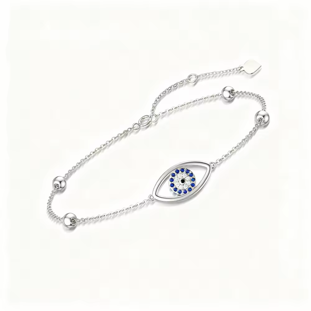 Descubre la perfecta combinación de elegancia y protección con nuestra pulsera de Oro Blanco de 10K con colgante de ojo maligno, diseñada para realzar tu estilo diario.