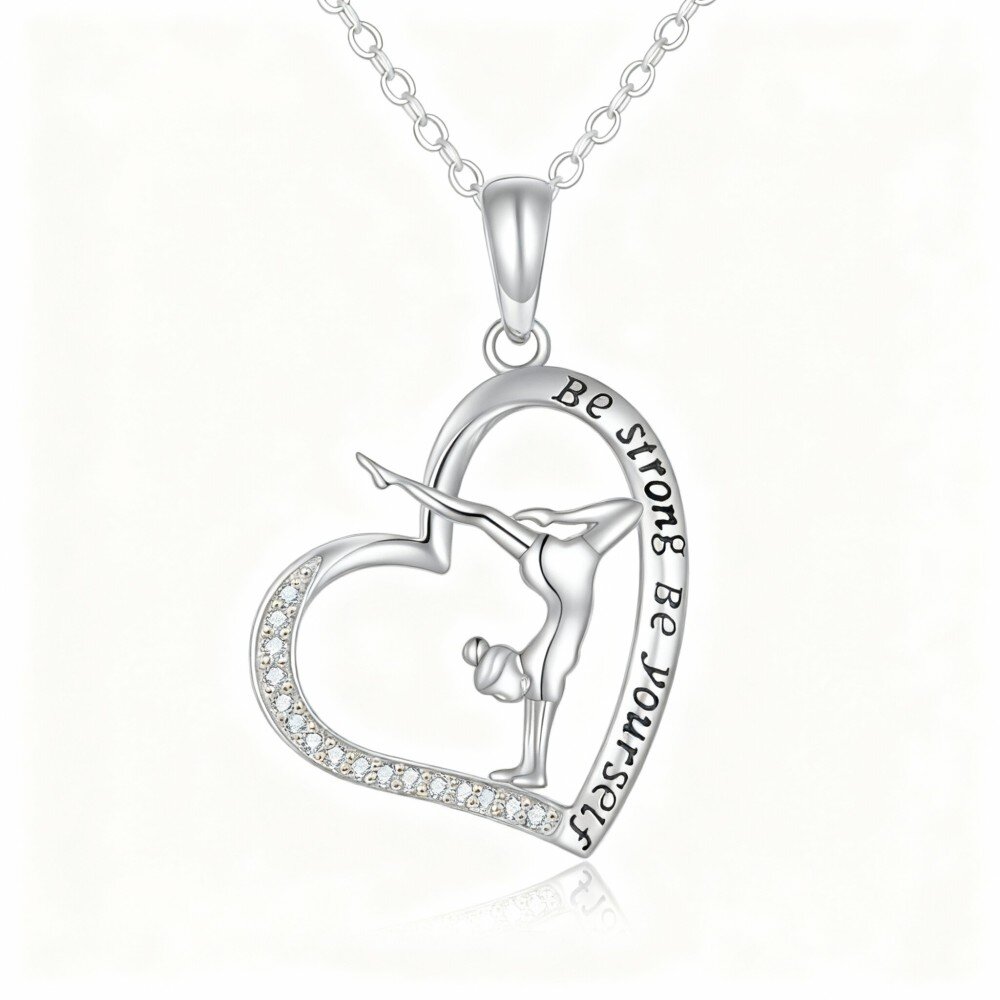 Celebra tu fuerza y estilo único con nuestro impresionante collar de Oro Blanco que presenta a una gimnasta dentro de un corazón, perfecto para inspirar a mujeres en todas partes.