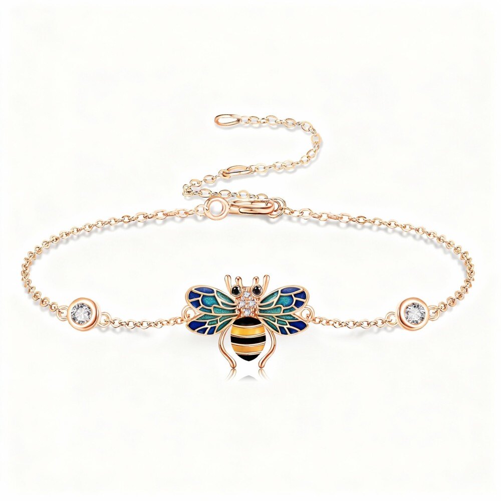 Elaborada en lujoso Oro Rosa de 14 quilates, esta pulsera con dijes luce un diseño único de abeja que simboliza el trabajo duro y la comunidad, dándole un significado especial a tu look. La pulsera brilla con circonitas cúbicas engastadas de forma intrincada, brindándole un brillo radiante que llama la atención. Su longitud ajustable garantiza un ajuste perfecto a cada muñeca, lo que la convierte en una excelente opción de regalo para cumpleaños, aniversarios o simplemente porque sí. Descubre tu individualidad y encanto, expresando tu estilo personal con este hermoso accesorio.