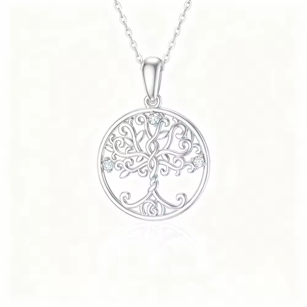 Descubra nuestro exquisito Collar Colgante de Oro Blanco de 14K, con una deslumbrante gema Moissanite, intrincadamente diseñada con el simbólico Árbol de la Vida, perfecto para la mujer moderna y elegante.