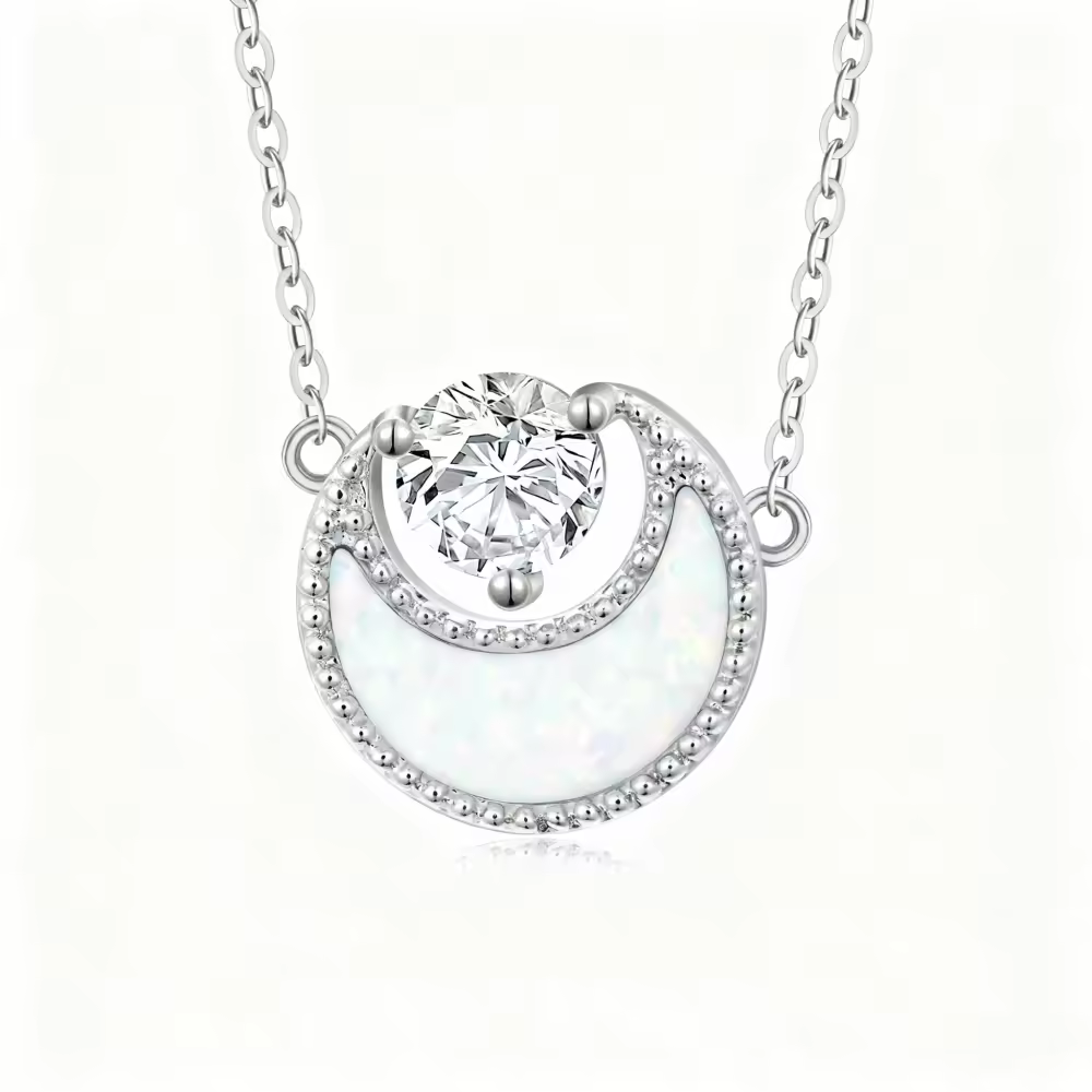 Esta impresionante pieza presenta un ópalo genuino que irradia con cada movimiento, elegantemente envuelto en lujoso Oro Blanco de 18K. El cautivador diseño en forma de luna está adornado con piedras de circonita cúbica dispuestas con precisión que reflejan la luz maravillosamente desde todos los ángulos, convirtiéndolo en un accesorio perfecto para realzar cualquier atuendo. Diseñado para quienes valoran la excepcional artesanía y el misterio del cielo nocturno, este collar es una adición esencial a cualquier colección de joyas. Ya sea que te estés preparando para una ocasión especial o agregando un toque de elegancia a tu estilo diario, este collar promete ser una pieza distintiva que capturará la atención y admiración. Celebra tu estilo único y abraza el encanto celestial con nuestro exquisito collar, diseñado para aportar un toque de magia a tu vida.