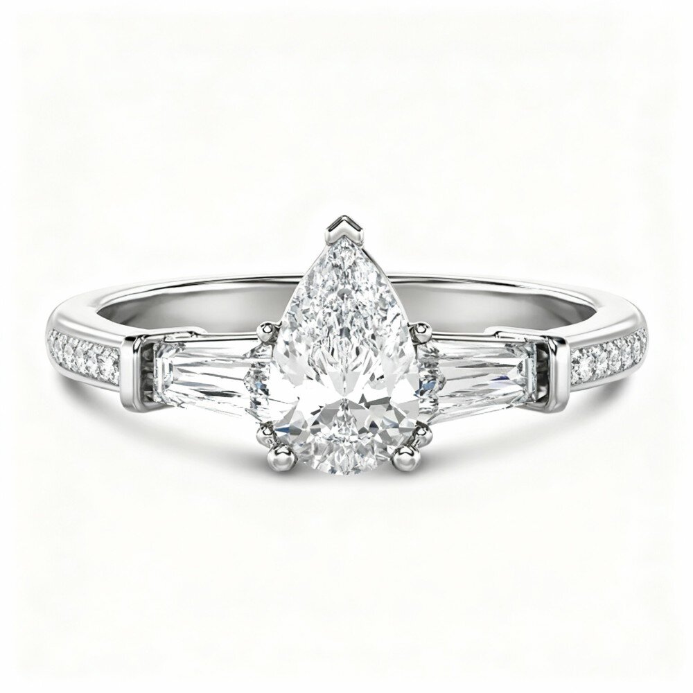 Elaborado en Oro Blanco 18K de primera calidad, este anillo de compromiso está diseñado para cautivar con su moissanita en forma de pera en el centro, flanqueada por dos piedras brillantes para mayor resplandor. El intrincado engaste de tres piedras simboliza tu pasado, presente y futuro, convirtiéndolo en una representación perfecta del amor duradero. Cada detalle está meticulosamente elaborado para garantizar una calidad y belleza incomparables, ideal para novias que buscan lujo y significado. El diseño elegante asegura que será atesorado como una reliquia familiar por generaciones. Ya sea para un compromiso, aniversario u ocasión especial, este anillo es una declaración atemporal de amor y compromiso.