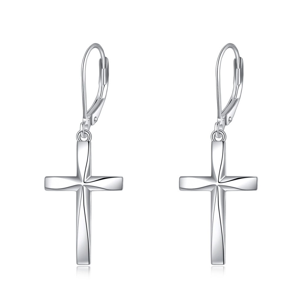Descubra la elegancia de nuestros pendientes con cierre de palanca en plata de ley bañados en oro blanco, diseñados específicamente para mujeres que aprecian la belleza atemporal y el encanto sofisticado, con un diseño de cruz clásico y sin piedras para un toque minimalista.