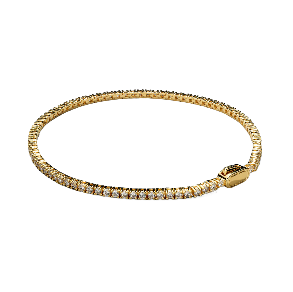 Esta exquisita pulsera de tenis ICED presenta una impresionante hilera de piedras de talla brillante de 2 mm, cada una meticulosamente seleccionada y colocada por expertos en un engaste seguro de oro de 18 quilates de cuatro puntas.